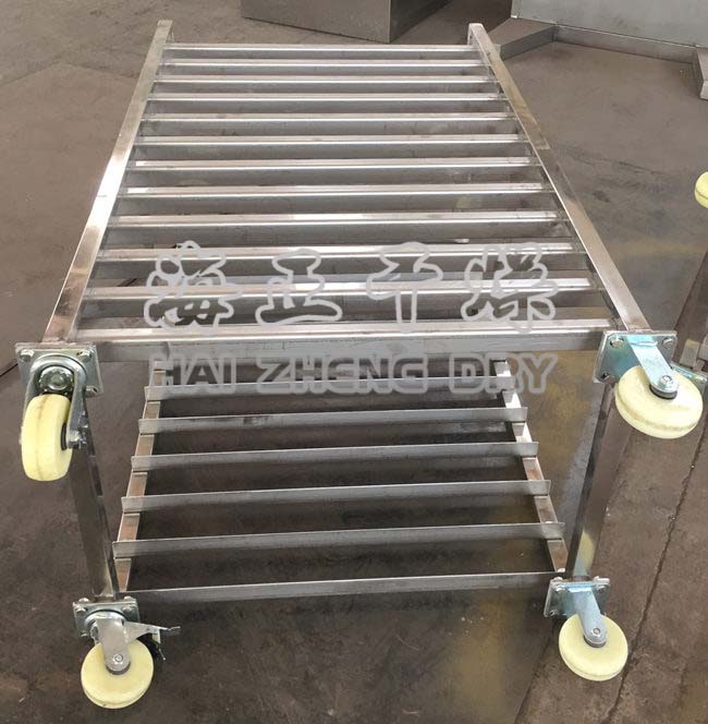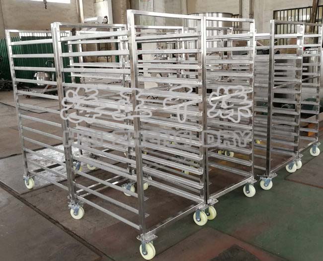 1、材质:SUS304 2、外形尺寸:950×710×1450mm 3、布置:每层放置2只烘盘,共计12层。常规烘车层间距100mm,也可根据烘箱的尺寸定做层间距和层数。 4、有效承重:标准型120KG,另外可以按需定制120-500KG。 5、制造工艺:不锈钢方管经模具焊接后整体精细抛光,另外根据物料的承重可增加些加强筋。 6、烘车支持:标配尼龙脚轮,可选配全不锈钢脚轮、不锈钢加重轮和不锈钢带刹车轮子。